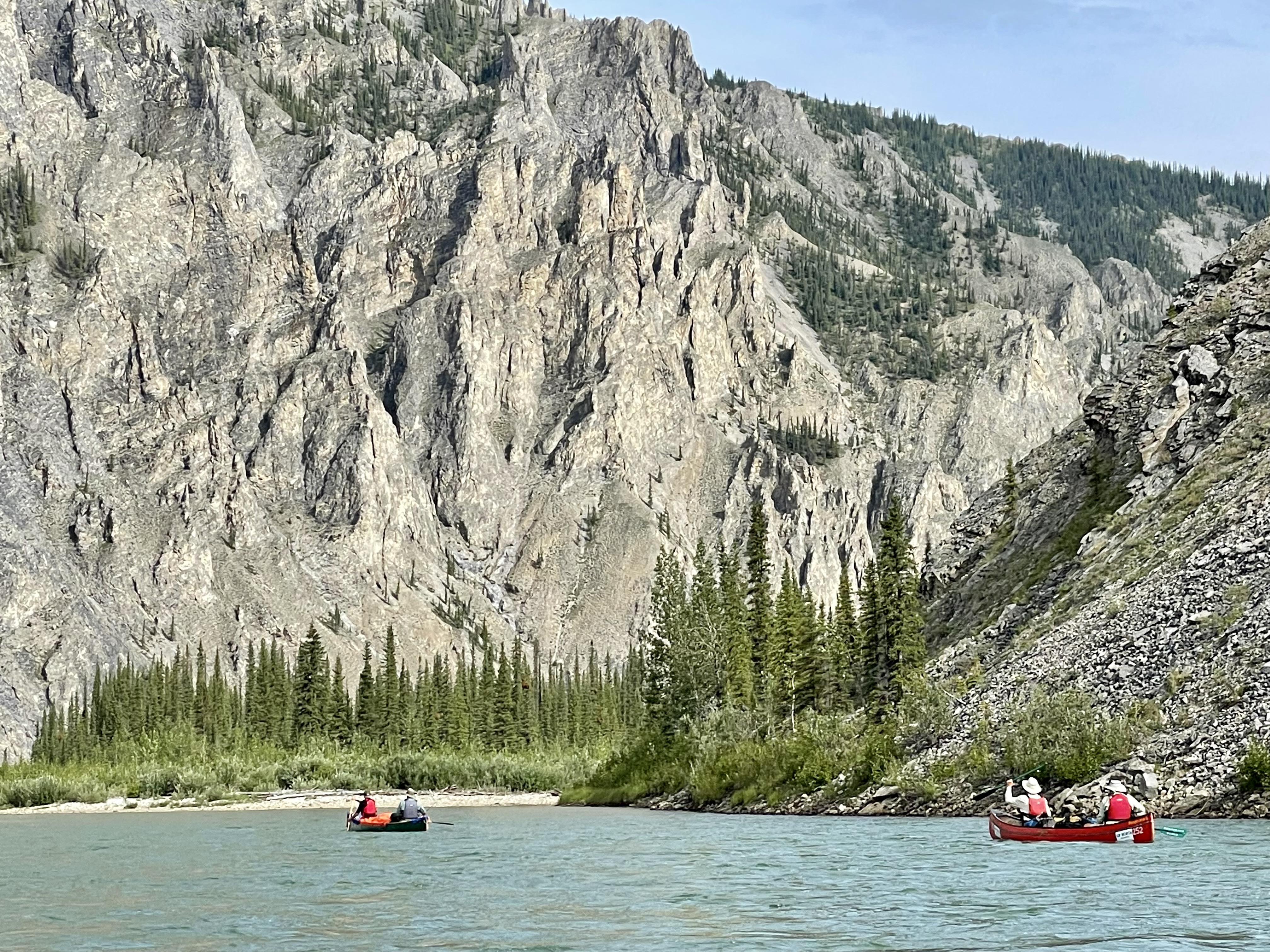 During its two-hundred mile flow, the Hart River passes beneath two mountain ranges: the Werneckes and the Ogilvies. These steep slopes stunned us with sediments of tan, gray, maroon and black hues. Rounding each serpentine river bend, a new peak would show itself. I was dizzied by the height of the spires and blurted out a hearty “Wow!” From the canoe next to me I heard “Holy Smokes!” From the third canoe came a duet of “Oh my God!” and “Holy shit!”